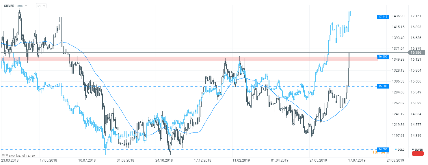 Ostatni tydzień przynosi dużą zmienność na rynku surowców, Na szczególną uwagę zasługuje rynek srebra. Od początku tygodnia utrzymują się silne wzrosty na tym surowcu. Licząc od poniedziałku, jest to już ruch na ponad 7,5%.Kupujący nie odpuszczają, po wybiciu nowych tegorocznych szczytów, ruch w górę jest kontynuowany. Na piątkowej sesji srebro znajduje się już ponad 1,2%, jeszcze przed wejściem inwestorów ze Stanów Zjednoczonych do gry. Patrząc technicznie na wykres, kluczowym wsparciem jest pokonana wczoraj strefa przy poziomie 16,15$. Tak długo jak kurs znajduje się powyżej, obowiązuje scenariusz wzrostowy. Po wybiciu wspomnianego oporu, niewykluczony jest nawet ruch w kierunku szczytów z czerwca 2018 roku - okolice poziomu 17,15$. Oczywiście korekta byłaby czymś zupełnie “zdrowym” i może ona wystąpić w każdej chwili, Niemniej przy tak silnej tendencji, jaką aktualnie obserwujemy na srebrze, nie należy na siłę szukać wierzchołka i odwrócenia trendu.