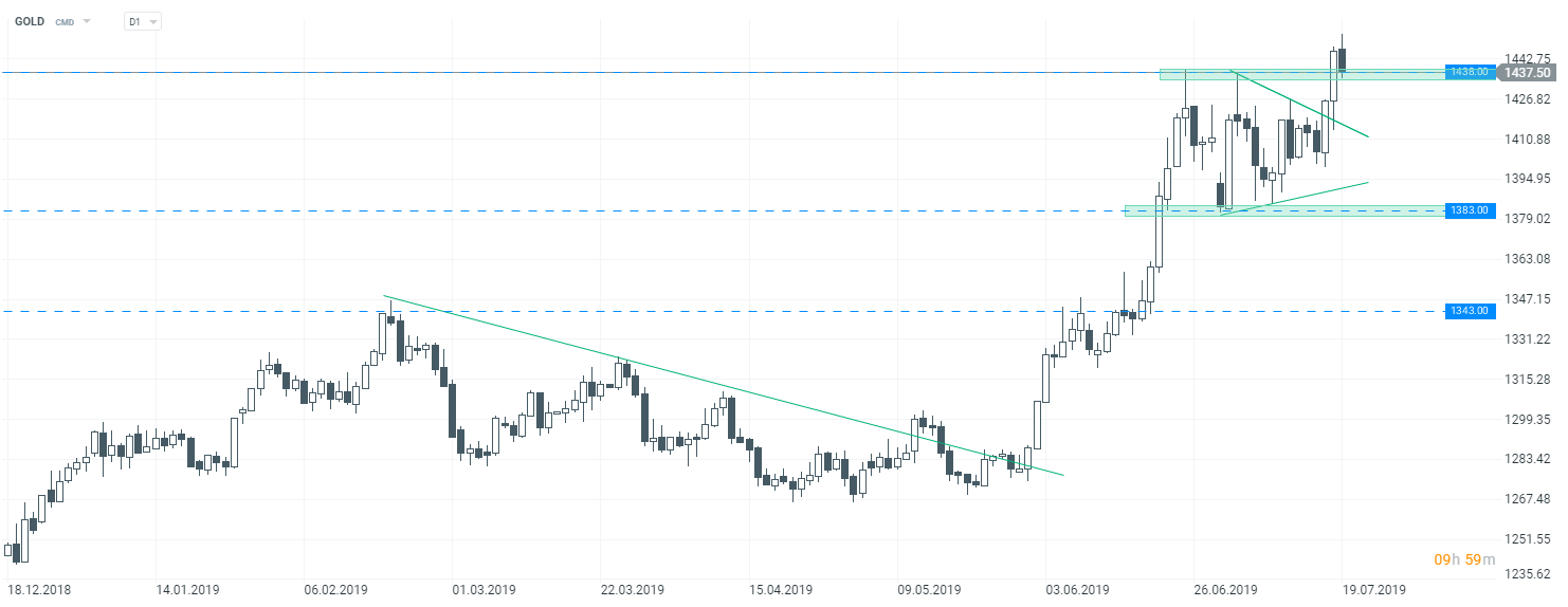 Wczoraj mogliśmy obserwować wyraźne wzrosty na rynku złota, czwartkowa sesja zakończyła się wynikiem na poziomie +1,28% Niemniej w nocy szczyty zostały poprawione, zaraz po północy rynek zdołał wyjść jeszcze 6 dolarów wyżej. Po szybkimi spike'u w górę, rozpoczęła się korekta spadkowa. Dziś złoto znajduje się blisko 0,3% pod kreską. Aktualnie testowana jest kluczowa strefa wsparcia, która wynika z wysokości poprzednich wierzchołków (szczyty z 25 czerwca i 3 lipca). Jeśli obszar zaznaczony kolorem zielonym zostanie obroniony, ruch w górę powinien być kontynuowany. Złoto od dłuższego czasu znajduje się w trendzie wzrostowym i jak na razie nic nie wskazuje na to, aby miał on się zmienić. Oczywiście korekta spadkowa jest w każdej chwili możliwa, niemniej sygnałów na ruch w dół brakuje. A zgodnie z powiedzeniem “Trend jest twoim przyjacielem”, nie należy na siłę szukać końca impulsu wzrostowego. Dużo prościej określić koniec korekty spadkowej.