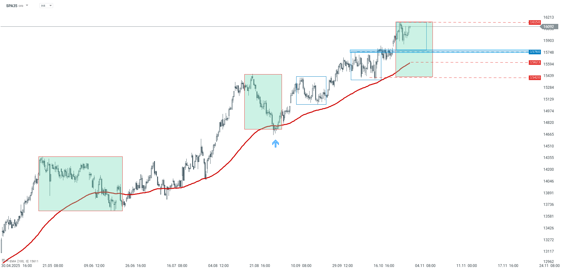 Patrząc technicznie na wykres SPA35 na interwale czterogodzinowym, od dłuższego czasu możemy obserwować wyraźny trend wzrostowy. Cena dwukrotnie wykonała korektę rzędu 700 punktów, które zostały zaznaczone czerwonym prostokątem na poniższym wykresie, a następnie dochodziło do wyznaczania nowych wierzchołków. Aktualnie cena znajduje się w rejonach lokalnych maksimów, dlatego trend wzrostowy może być kontynuowany. Natomiast gdyby doszło do cofnięcia, w pierwszej kolejności należy zwrócić uwagę na wsparcie przy poziomie 15 760 punktów, gdzie znajdują się wcześniejsze lokalne wierzchołki, a także dolne ograniczenie lokalnej geometrii 1:1, wynikającej z zaznaczonego na poniższym wykresie niebieskiego prostokąta – w przeszłości pojawiały się już dwie korekty o dokładnie tym samym zasięgu. Gdyby jednak okazało się, że potencjalna korekta będzie większa, kolejne wsparcia powinny stanowić odpowiednio poziomy 15 623 punktów i 15 420 punktów, które wynikają odpowiednio ze średniej 100-okresowej zaznaczonej czerwoną linią oraz z dużej wspomnianej wcześniej geometrii 1:1. Natomiast jeżeli trend wzrostowy będzie kontynuowany i dojdzie do przebicia ostatnich wierzchołków przy poziomie 16 150 punktów, wówczas wspomniane wcześniej geometrie należy przesunąć wraz z ruchem ceny, a w momencie wystąpienia ewentualnej korekty ich dolne ograniczenia będą stanowiły kluczowe wsparcia.