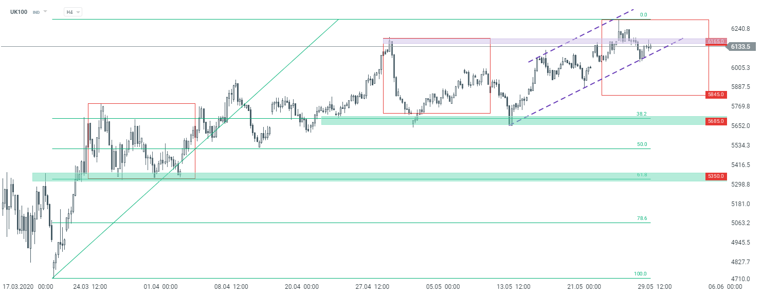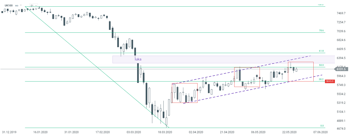Rynek akcji w USA radzi sobie w ostatnim czasie zdecydowanie lepiej niż ten w Europie. Podczas gdy indeksy za oceanem odrobiły już większość przeceny z przełomu lutego i marca, tak główne parkiety na Starym Kontynencie zdołały wykonać korektę na 30-60% całego ruchu spadkowego. W dzisiejszej analizie przyjrzymy się sytuacji technicznej na UK100, czyli kontrakcie na londyński indeks FTSE100.