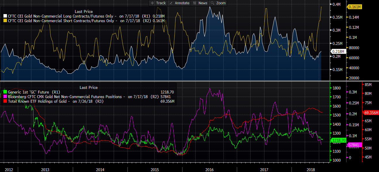 Liczba długich pozycji netto na złocie w ostatnich tygodniach mocno spadła. Kolejny odczyt poznamy o godzinie 21:30. Źródło: Bloomberg.