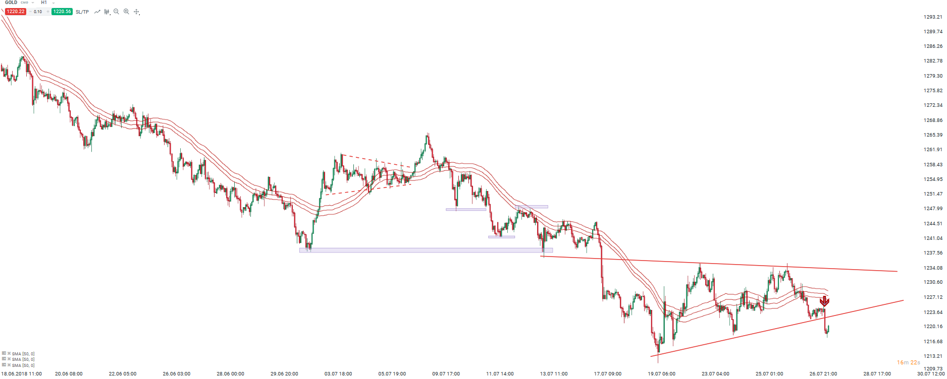 Na wykresie godzinowym kurs opuszcza zakres formacji trójkąta, która kształtowała się w ostatnich dniach na wykresie. Sugeruje to możliwość dalszych spadków, najpierw w okolice 1210 $ za uncję (ostatnie dołki), a następnie do 1200 $, co powinno stanowić psychologiczny poziom wsparcia. Potencjalny zasięg wybicia z tej formacji to 1180 $ za uncję, biorąc pod uwagę ruch spadkowy od 9 lipca.