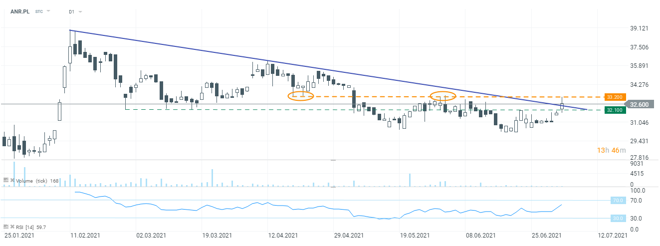 Pozytywna reakcja na kursie Answear.com (ANR.PL) przekraczała dziś 3%. Cena akcji została wywindowana powyżej linii trendu spadkowego, docierając do poziomu 33,20 PLN. Widać jednak, że w tym miejscu należy spodziewać się wyraźnego oporu (lokalne maksima i dołki z intraday z ostatnich miesięcy). Tym samym kurs powrócił już w okolice wspomnianej linii trendu spadkowego.