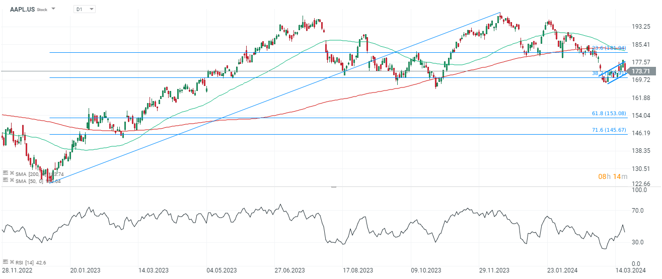 Akcje do niedawna największej spółki w USA notowane są w potencjalnie niedźwiedziej formacji flagi, którą może potwierdzić spadek poniżęj 169 USD za walor. Przecena względem SMA200 sięga obecnie blisko 7% i wskazuje na słaby sentyment wokół wyceny giganta z Doliny Krzemowej. Po doniesieniach o spadającej sprzedaży iPhone'a w Chinach podróż do kraju miał odbyć CEO, Tim Cook. Nie jest jasne jak i czy Apple uda się odwrócić niekorzystną dynamikę.