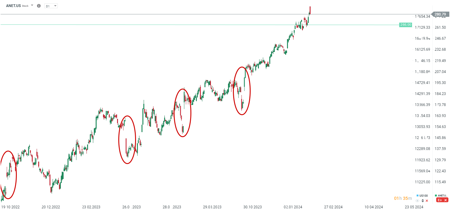 Podsumowując, Arista znajduje się na silnej pozycji do dalszego rozwoju, a wyniki za Q4 2023 r. przekroczyły oczekiwania. Prognozy na 2024 r. sugerują ostrożny optymizm ze względu na potencjalne przeciwności rynkowe, ale koncentracja firmy na rentowności i innowacyjności dobrze wróży na przyszłość. Warto zauważyć, że na początku tygodnia kurs akcji osiągnął rekordowy poziom powyżej 280 USD za akcję.