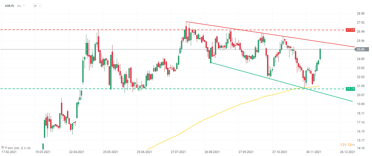 Walory spółki ASBIS (ASB.PL), interwał D1. Z perspektywy analizy technicznej akcje poruszają się obecnie w trendzie spadkowym, którego początku można doszukiwać się w pierwszej połowie sierpnia tego roku. Cena odbiła się od kluczowego wsparcia wyznaczonego przez dolne ograniczenie trendu spadkowego, wzmocnione przez 200 sesyjną wykładniczą średnią kroczącą (żółta linia). Informacje o pozyskaniu 20% akcji cypryjskiego Embio Diagnostics doprowadziły do otwarcia dzisiejszej sesji z byczą luką cenową. Jeśli stronie popytu uda się utrzymać wzrostowe momentum i przebić powyżej górnego ograniczenia (czerwona linia) możliwa będzie kontynuacja długoterminowego trendu wzrostowego. Źródło: xStation 5