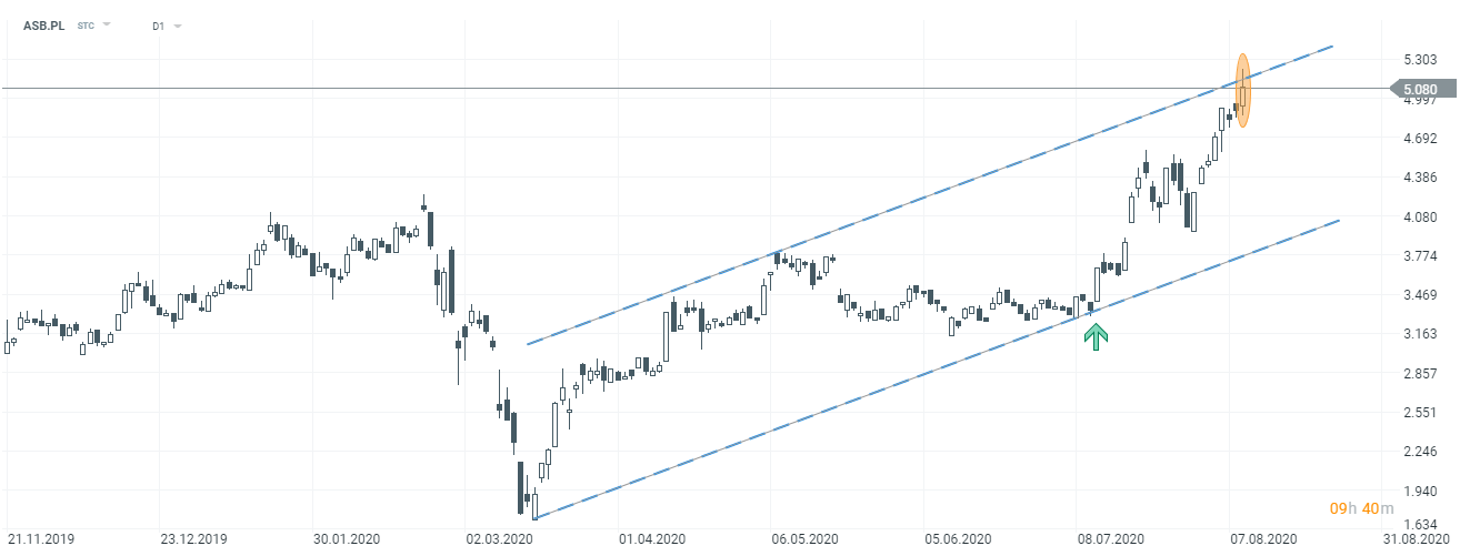 Od 13 lipca cena akcji dystrybutora sprzętu IT wzrosła już o blisko 50%. Dzisiejsze notowania przyniosły kolejną dużą lukę wzrostową, w efekcie czego doszło do naruszenia kanału wzrostowego, w którym kurs porusza się od marcowego dołka. Źródło: xStation5