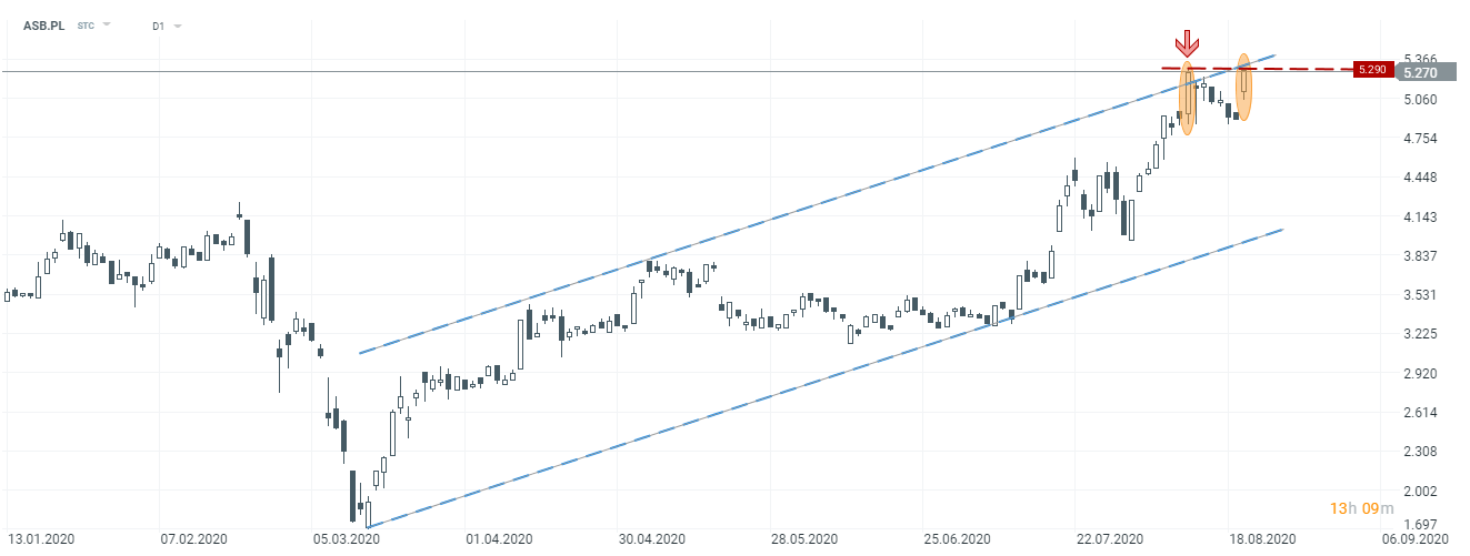 Mocna sprzedaż w lipcu sprzyja notowaniom spółki na GPW. Dzisiejsze wzrosty dają potencjał ponownego przebicia górnego ograniczenia kanału wzrostowego (poprzednie przebicie nastąpiło 11 sierpnia). Kluczowa może okazać się bariera 5,29 zł, czyli dzienne maksimum właśnie z dnia 11 sierpnia. W momencie publikacji tekstu kurs znajduje się nieznacznie poniżej (5,27 zł). Źródło: xStation5