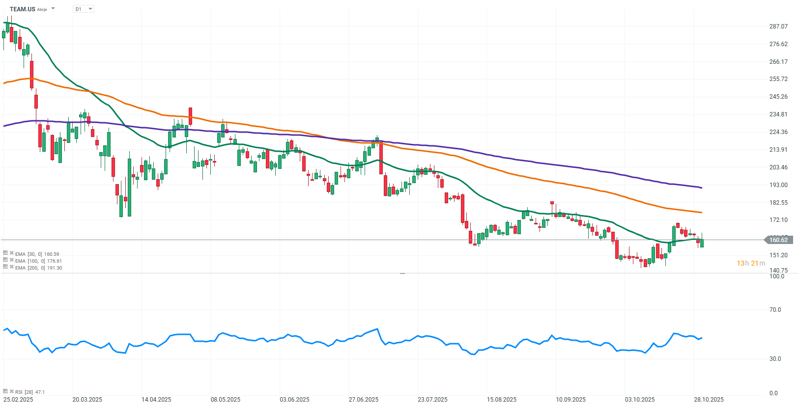Atlassian przedstawił wyniki za pierwszy kwartał roku fiskalnego 2026, które przewyższyły oczekiwania analityków zarówno w zakresie przychodów, jak i zysków. Przychody spółki osiągnęły 1,43 miliarda dolarów, co oznacza 21 procent wzrost rok do roku i przewyższa prognozy na poziomie 1,40 miliarda dolarów. Skorygowany zysk na akcję wyniósł 1,04 dolara, co znacząco przekroczyło konsensus wynoszący 0,84 dolara. Najbardziej dynamicznie rozwija się segment chmury, który wygenerował 998 milionów dolarów przychodów, co daje 26 procent wzrost rok do roku i stanowi około 70 procent całkowitych przychodów. Wzrost wykorzystania narzędzi sztucznej inteligencji jest równie imponujący, liczba miesięcznych aktywnych użytkowników sięgnęła 3,5 miliona, co oznacza 50 procent wzrost kwartał do kwartału, a Atlassian coraz wyraźniej pozycjonuje się jako strategiczna platforma AI dla klientów korporacyjnych.