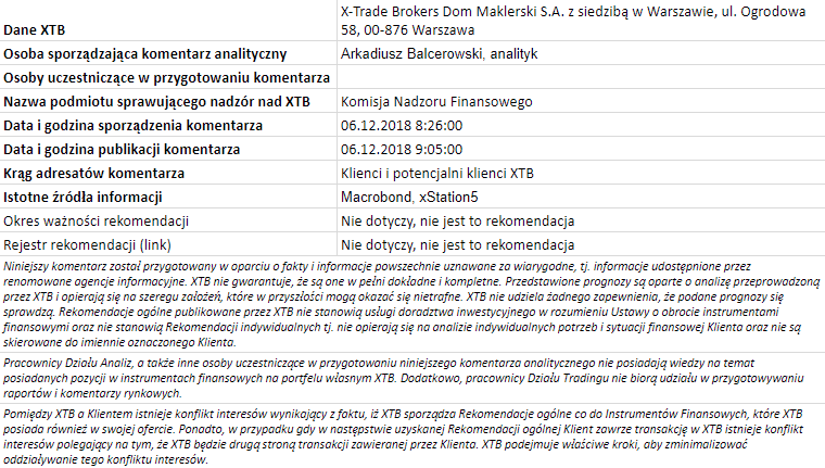 Azjatyckie indeksy giełdowe traciły podczas czwartkowej sesji w następstwie bardzo słabego wznowienia handlu za oceanem. Otwarcie kontraktów terminowych w USA zaowocowało znaczną presją podażową, co zmusiło giełdę (CME) do tymczasowego zatrzymania handlu (spadki sięgały blisko 2%). Z tego też powodu minorowe nastroje w Azji nie specjalnie dziwią. Hang Seng traci obecnie 2,7%, podczas gdy indeks w Szanghaju osuwa się blisko 1,7%, NIKKEI zamknął dzień stratą równą 1.9%. Jeszcze wczorajszego wieczoru otrzymaliśmy informację o aresztowaniu dyrektora finansowego Huawei w Kanadzie, które jednak miało już miejsce w minioną sobotę. CFO spółki Meng Wanzhou może zostać poddana ekstradycji do USA pod zarzutami naruszenia amerykańskich sankcji na Iran poprzez sprzedaż sprzętu elektronicznego do tamtejszych jednostek. Ta informacja z pewnością nie pomogła rynkom akcji podczas sesji azjatyckiej, a komentarze chińskiej prasy tylko dolały oliwy do ognia. Mianowicie, jeden z dzienników napisał, iż ani USA ani Kanada nie mają prawa więzić chińskich obywateli dodając, iż Wanzhou stała się zakładniczką sporu handlowego między USA a Chinami. Co więcej, chińska ambasada w Kanadzie skrytykowała obydwa kraje Ameryki Północnej i zażądała natychmiastowego uwolnienia CFO. Jeśli kwestia ta nie zostanie zakończona w najbliższym czasie może ona stać się pretekstem do zerwania wypracowanego, tymczasowego porozumienia między USA a Chinami (brak nakładania ceł przez okres 90 dni).