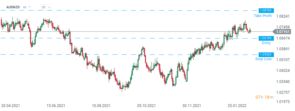 Credit Suisse rekomenduje złożenie zlecenia oczkującego na długą pozycję na AUDNZD na poziomie 1.0670 z celem 1.0870 i zleceniem stop loss na poziomie 1.0550. Źródło: xStation 5