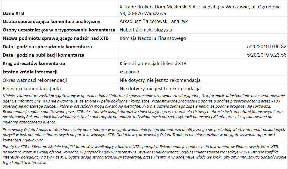 Ta publikacja handlowa jest informacyjna i edukacyjna. Nie jest rekomendacją inwestycyjną ani informacją rekomendującą lub sugerującą strategię inwestycyjną. W materiale nie sugerujemy żadnej strategii inwestycyjnej ani nie świadczymy usługi doradztwa inwestycyjnego. Materiał nie uwzględnia indywidualnej sytuacji finansowej, potrzeb i celów inwestycyjnych klienta. Nie jest też ofertą sprzedaży ani subskrypcji. Nie jest zaproszeniem do nabycia, reklamą ani promocją jakichkolwiek instrumentów finansowych. Publikację handlową przygotowaliśmy starannie i obiektywnie. Przedstawiamy stan faktyczny znany autorom w chwili tworzenia dokumentu. Nie umieszczamy w nim żadnych elementów oceniających. Informacje i badania oparte na historycznych danych lub wynikach oraz prognozy nie stanowią pewnego wskaźnika na przyszłość. Nie odpowiadamy za Twoje działania lub zaniechania, zwłaszcza za to, że zdecydujesz się nabyć lub zbyć instrumenty finansowe na podstawie informacji z tej publikacji handlowej. Nie odpowiadamy też za szkody, które mogą wynikać z bezpośredniego czy też pośredniego wykorzystania tych informacji. Inwestowanie jest ryzykowne. Inwestuj odpowiedzialnie.