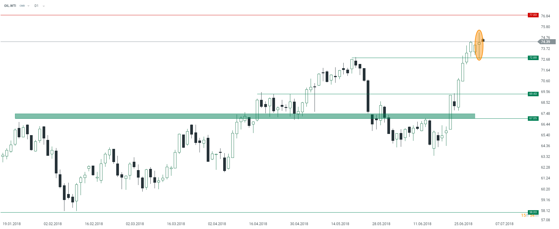 Po dosyć zmiennej sesji na ropie wczorajszego dnia, dla byków przyszła dobra wiadomość w postaci kolejnego solidnego spadku zapasów. Raport API pokazał spadek zapasów na poziomie 4,5 mln brk, co było znacząco większym spadkiem niż oczekiwał rynek. Oprócz tego zapasy benzyny spadły o 3,1 mln brk, przy oczekiwaniu spadku jedynie na poziomie 1 mln brk. Warto przypomnieć, że przez dzisiejsze święto, raport DOE będzie opublikowany jutrzejszego dnia.