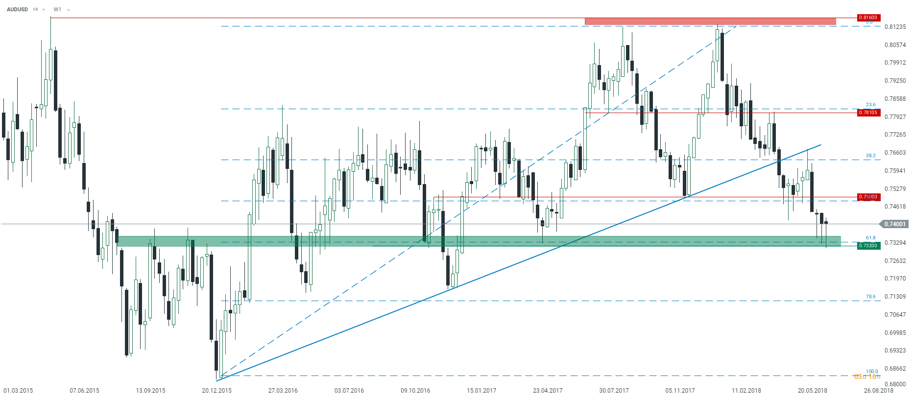 Technicznie AUDUSD wydaje się być w krytycznym momencie dla potencjalnego odwrotu trendu. Najbliższy opór zlokalizowany jest niewiele powyżej przy poziomie 0,7500. Źródło: xStation5