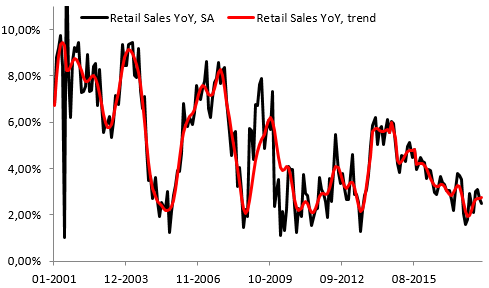 Największe pozytywne zaskoczenie nadeszło w postaci wyższej sprzedaży detalicznej w Australii, która wypadła na poziomie 0,4% m/m przy oczekiwaniu 0,3% m/m. Poprzedni odczyt został zrewidowany w górę z poziomu 0,4% do poziomu 0,5% w ujęciu miesięcznym. Jest to bardzo ważna informacja dla banku centralnego, który wskazał, że popyt konsumencki jest największą niewiadomą w Australii, co jest związane m.in. z dłużym zadłużeniem i rosnącymi kosztami obsługi kredytów, przy ograniczonym wzroście płac. Jak widać, trend bazowy może znajdować się w kluczowym miejscu, gdzie może zmienić się trend ostatnich kilku lat.