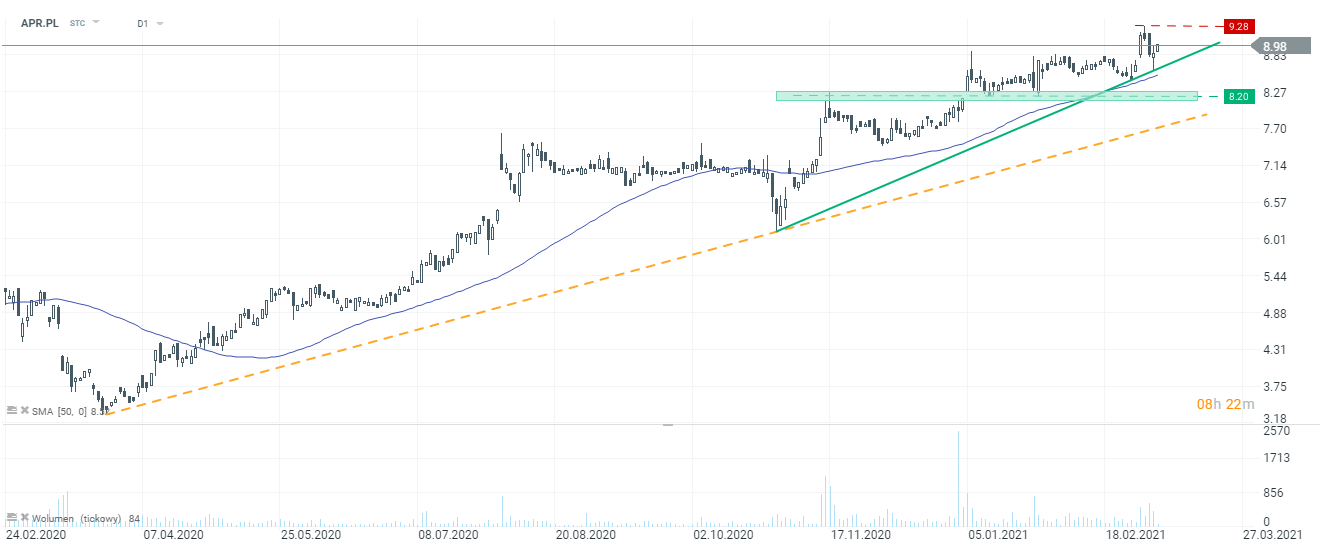 Patrząc na dzienne notowania spółki, walory znajdują się nieznacznie poniżej historycznych szczytów. Szczyt intraday został wyznaczony w dniu 3 marca i wyniósł 9,28 zł. W oparciu o niedawne poziomy cenowe można narysować przyspieszoną linię trendu wzrostowego (zielona linia). W przypadku przejęcia kontroli przez stronę podażową i przebicia tej linii w dół warto będzie skupić się na barierze 8,20 zł, która wydaje się być ważnym poziomem i mogłaby stać się wsparciem. Niemniej sentyment do spółek motoryzacyjnych z GPW jest w ostatnich tygodniach pozytywny, o czym świadczą również wyraźne wzrosty na Inter Cars (CAR.PL).