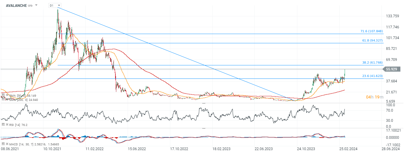 Spadek Bitcoina w okolice 70,000 USD spowodował cofnięcie wśród notowań większości altcoinów, ale jak dotąd poziom jest broniony, a akcje Microstrategy (MSTR.US) opierają się spadkom wskazujac, że rynek nie oczekuje głębszej korekty rynku crypto. Kryptowaluta Avalanche notuje najwyższe poziomy od blisko 2 lat i wspina się do poziomów niewidzianych od wiosny 2022 roku.