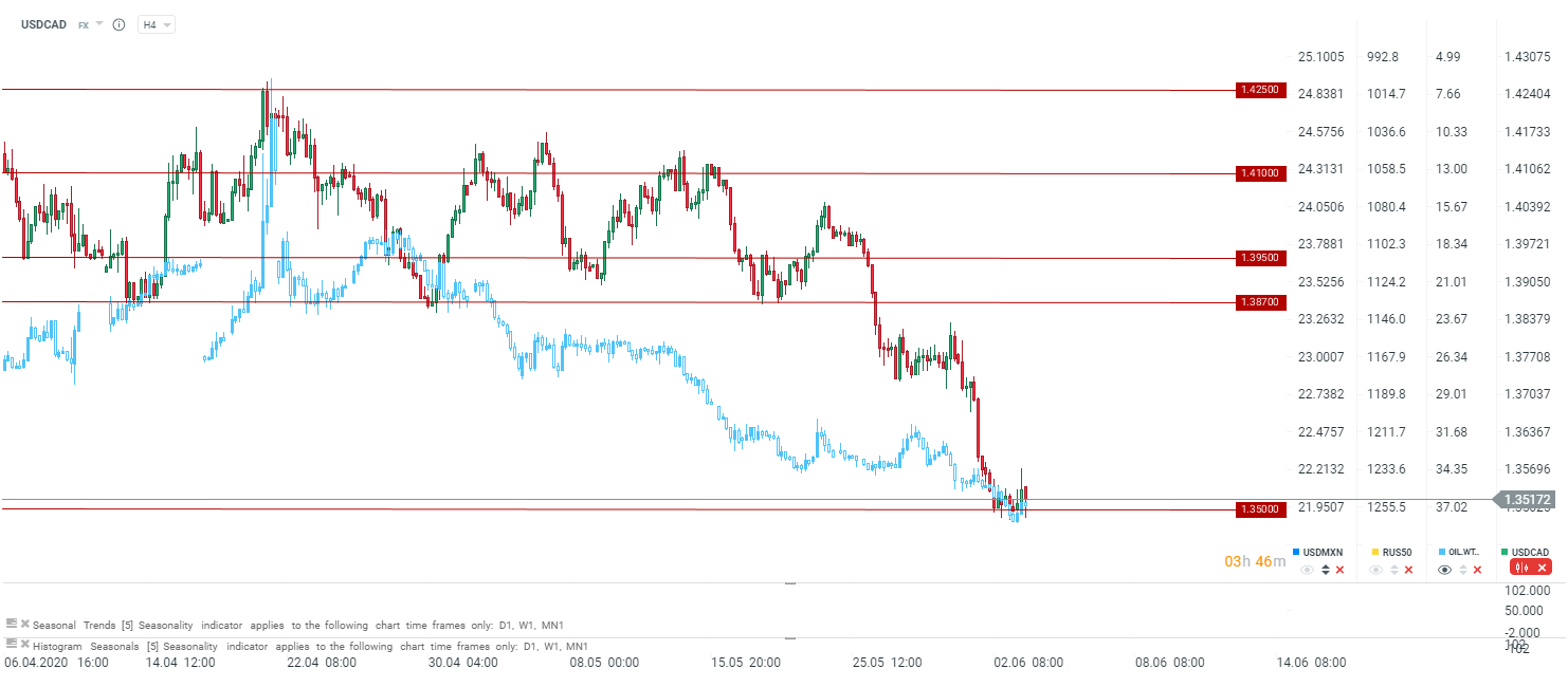 USDCAD zatrzymuje się w okolicach poziomu 1,3500. Również ropa konsoliduje się poniżej 37 USD za baryłkę, po tym jak OPEC poinformował, że jutrzejsze spotkanie jest mało prawdopodobne. Źródło: xStation5