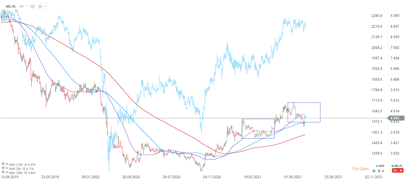 Akcje Millenium próbowały odbijać w tym tygodniu, co pozwoliło na zachowanie struktury overbalance. Aktualnie testowana jest średnia 50 sesyjna. Zejście poniżej średniej 100 dniowej może mieć bardzo negatywny wydźwięk dla sentymentu na akcjach spółki. Źródło: xStation5