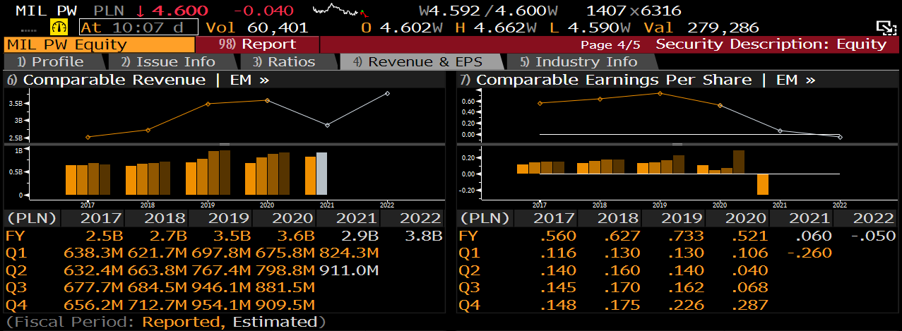 Jak widac przychody mają zaliczyć wyraźny wzrost za Q2 w porównaniu do zeszłęgo roku czy Q1 tego roku. Nie mamy jednak konsensusu dla EPSu. Całoroczny EPS ma być wg oczekiwań pozytywny, choć widać, że w Q1 bank miał wyraźną stratę. Źródło: Bloomberg