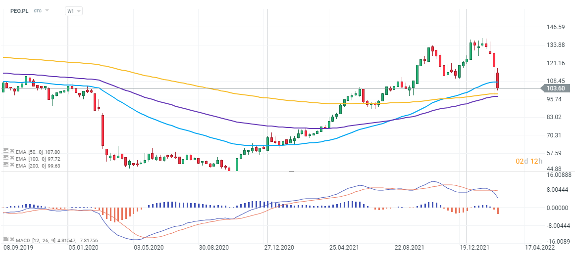 Wykres walorów banku Pekao SA (PEO.PL), interwał W1. Walory banku testują obecnie silny poziom wsparć, wyznaczony przez 50-, 100- oraz 200- tygodniowe, wykładnicze średnie kroczące (odpowiednio niebieska, fioletowa oraz złota linia). Źródło: xStation 5