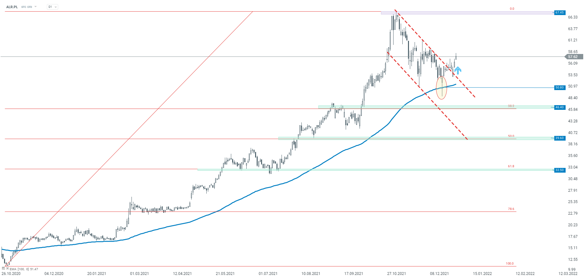 Ciekawie wygląda sytuacja techniczna na notowaniach Alior Banku (ALR.PL), gdzie 20 grudnia doszło do odbicia od średniej z ostatnich 100 okresów, jak i pojawienia się pro wzrostowej formacji młota na interwale D1. Ponadto notowania opuściły lokalny kanał wzrostowy, przez co istnieje szansa na powrót do głównego trendu - wzrostowego. Gdyby jednak doszło do cofnięcia, wspomniana średnia EMA100 pozostaje kluczowym wsparciem.