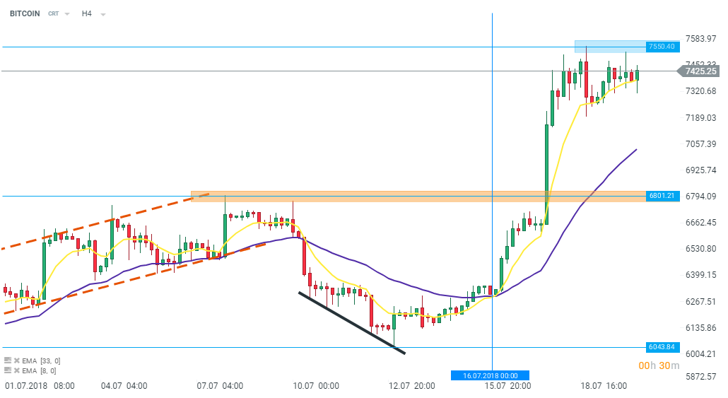 BITCOIN w przeciwieństwie do innych istotnych kryptowalut bierze oddech. Wirtualna waluta poruszała się w tym tygodniu wyraźnie inaczej niż pozostałe monety. Obecnie kryptowaluta uspokoiła się w okolicach 7400 dolarów nieco poniżej prawdopodobnego poziomu oporu na 7550 dolarów (niebieski obszar). BITCOIN być może będzie testował ten poziom w niedalekiej przyszłości. Źródło: xStation5
