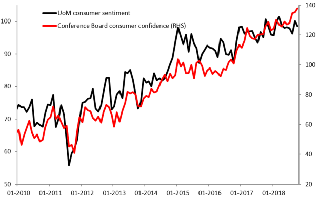 Październikowy odczyt Conference Board wypadł powyżej oczekiwań na poziomie 136 pkt. i wyniósł 137,9 pkt., co jest kolejnym rekordem od kilkunastu lat. Conference Board wskazuje na najlepsze oczekiwania i nastroje gospodarstw domowych od 2000 roku. Warto jednak wspomnieć, że mocno zrewidowano odczyt za wrzesień, który wyniósł w rzeczywistości do 135,3 pkt. (z wcześniejszych 138,4 pkt.). Dane wypadły lepiej pomimo słabszego odczytu Uniwersytetu Michigan za październik, który poznaliśmy na piątkowej sesji.