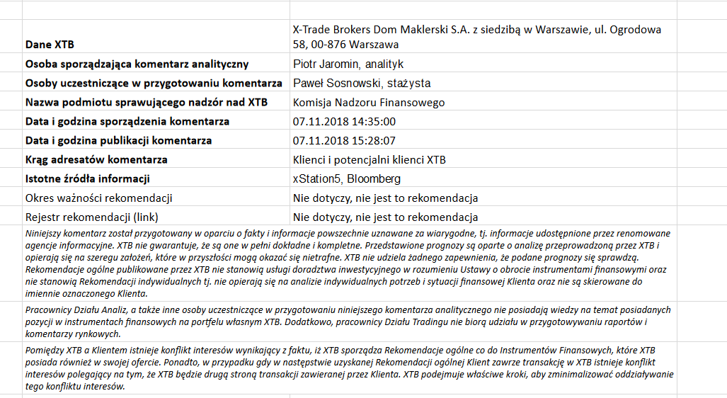 Ta publikacja handlowa jest informacyjna i edukacyjna. Nie jest rekomendacją inwestycyjną ani informacją rekomendującą lub sugerującą strategię inwestycyjną. W materiale nie sugerujemy żadnej strategii inwestycyjnej ani nie świadczymy usługi doradztwa inwestycyjnego. Materiał nie uwzględnia indywidualnej sytuacji finansowej, potrzeb i celów inwestycyjnych klienta. Nie jest też ofertą sprzedaży ani subskrypcji. Nie jest zaproszeniem do nabycia, reklamą ani promocją jakichkolwiek instrumentów finansowych. Publikację handlową przygotowaliśmy starannie i obiektywnie. Przedstawiamy stan faktyczny znany autorom w chwili tworzenia dokumentu. Nie umieszczamy w nim żadnych elementów oceniających. Informacje i badania oparte na historycznych danych lub wynikach oraz prognozy nie stanowią pewnego wskaźnika na przyszłość. Nie odpowiadamy za Twoje działania lub zaniechania, zwłaszcza za to, że zdecydujesz się nabyć lub zbyć instrumenty finansowe na podstawie informacji z tej publikacji handlowej. Nie odpowiadamy też za szkody, które mogą wynikać z bezpośredniego czy też pośredniego wykorzystania tych informacji. Inwestowanie jest ryzykowne. Inwestuj odpowiedzialnie.