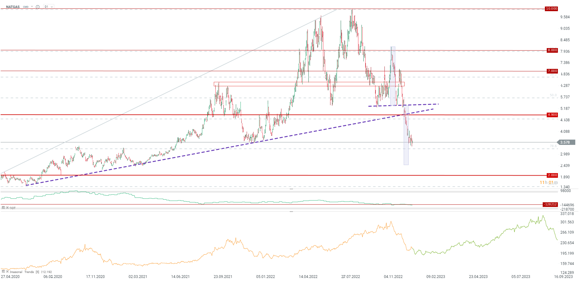 Cena straciła spadkowy impet, choć jednocześnie przebiła lokalne dołki z przełomu 2021 oraz 2022 roku. Kluczowe wsparcie to 3,2-3,3 przy zniesieniu 78.6. Źródło: xStation5