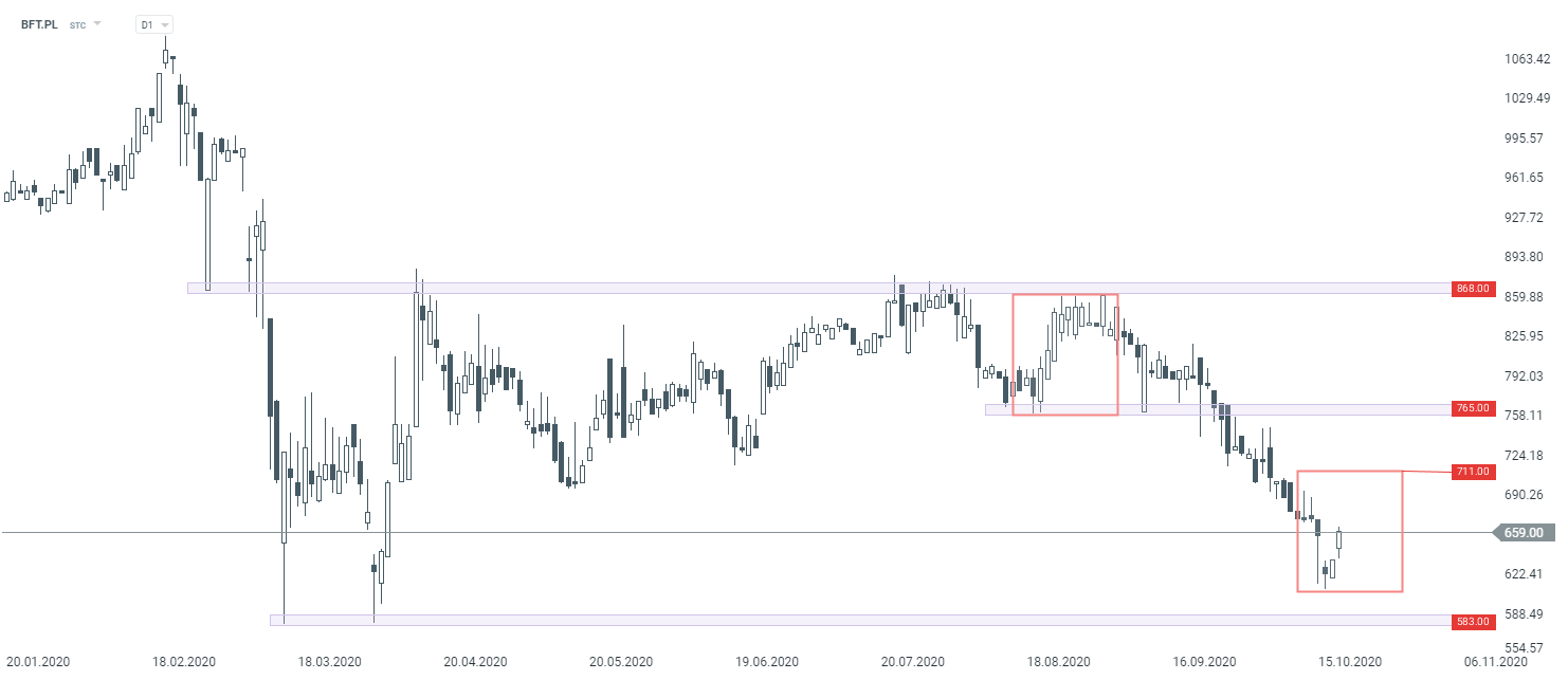 Podczas dzisiejszej sesji możemy obserwować wyraźne wzrosty na spółce Benefit Systems (BFT.PL). Patrząc technicznie na interwał D1, spadki zostały wyhamowane tuż przed marcowymi dołkami. Najbliższy opór wypada przy poziomie 711 zł, gdzie znajduje się górne ograniczenie układu 1:1, kolejny wypada z kolei na wysokości ostatnich lokalnych dołków przy 765 zł. Ponowne otwarcie branży fitness może potencjalnie zachęcić rynkowych byków do zakupów. Źródło: xStation5