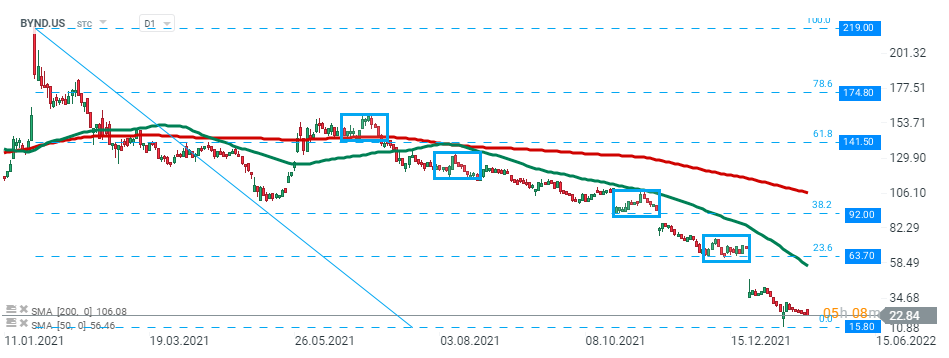 W ciągu ostatnich 12 miesięcy kurs akcji Beyond Meat spadł o blisko 80% i obecnie notowany jest poniżej ceny z debiutu w 2019 roku. Źródło: xStation 5