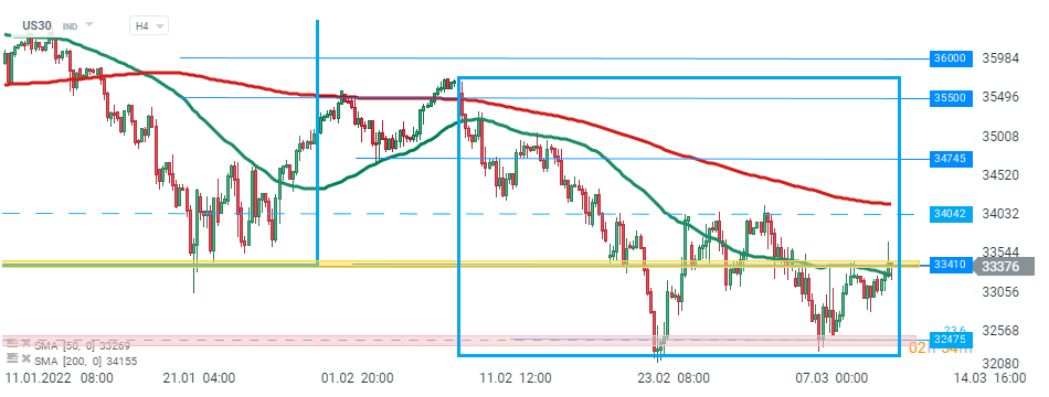 Przemówienie prezydenta Bidena nie wywołało żadnych istotnych ruchów na rynkach. Indeks US30 przesunął się nieznacznie w górę i testuje lokalny opór na poziomie 33410 pkt. Źródło: xStation5