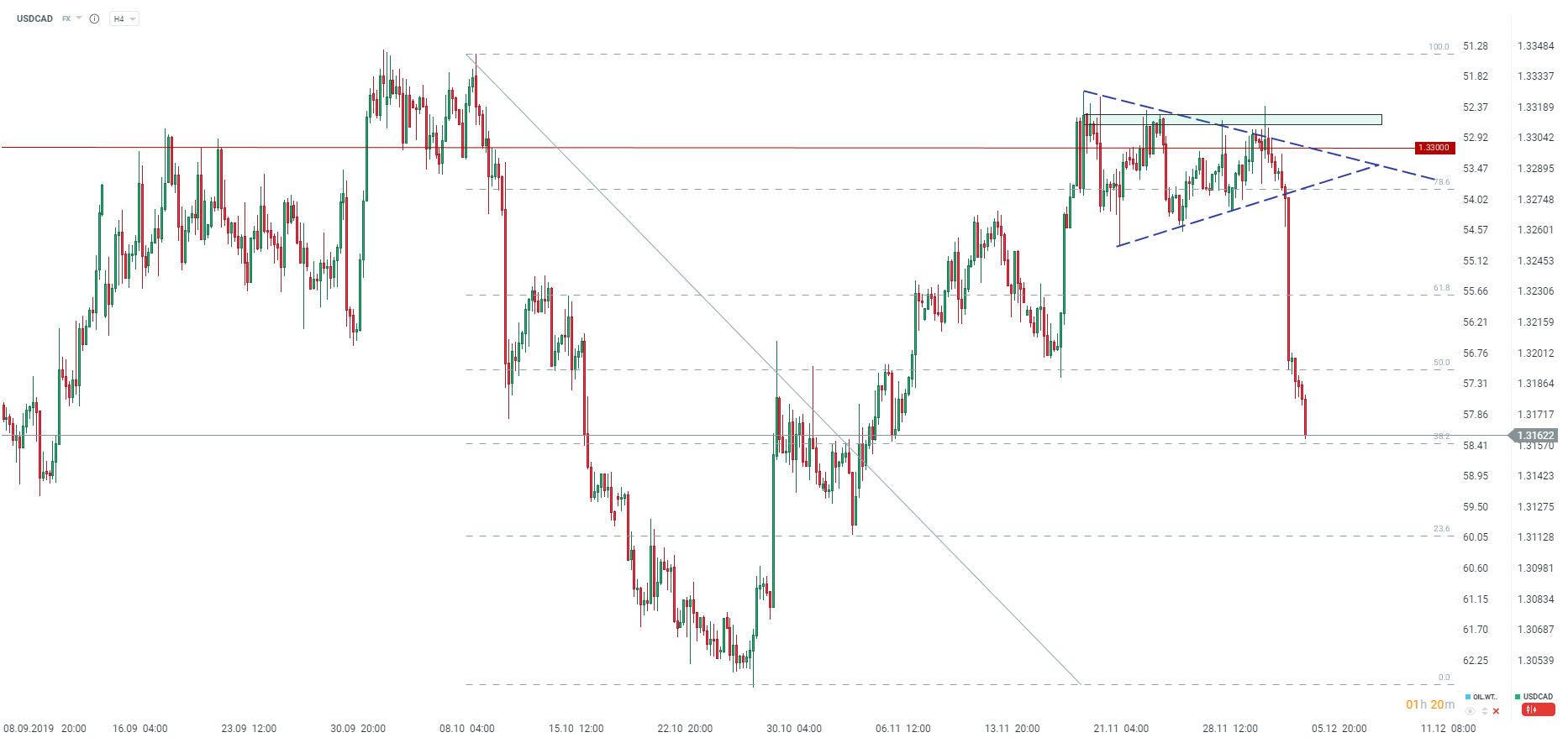 USDCAD kontynuuje wyraźne spadki, choć umocnienie CADa jest zmotywowane głównie ropą oraz wydźwiękiem wczorajszej decyzji BoC. Źródło: xStation5