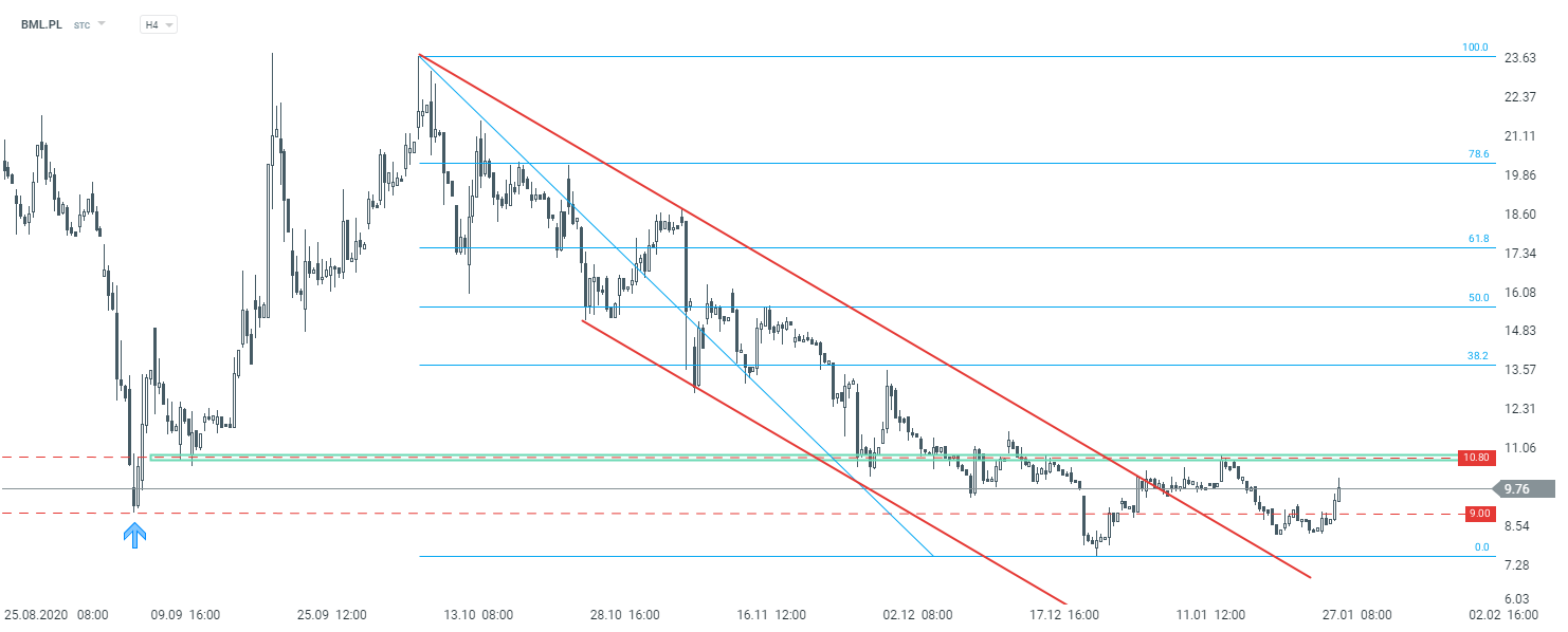 Patrząc na wykres H4, w ostatnim czasie doszło do wybicia z kanału spadkowego, a także powrotu powyżej dołków z września. Niemniej aby mówić o większym odreagowaniu, kurs musiałby pokonać opór przy 10,80 zł, który pozostaje kluczowy w średnim terminie. Jeżeli dojdzie do jego zanegowania, zgodnie z klasyczną analizą techniczną (teoria Dowa), będzie mieli do czynienia z pierwszym wyższym dołkiem, co mogłoby zapowiadać większe wzrosty.