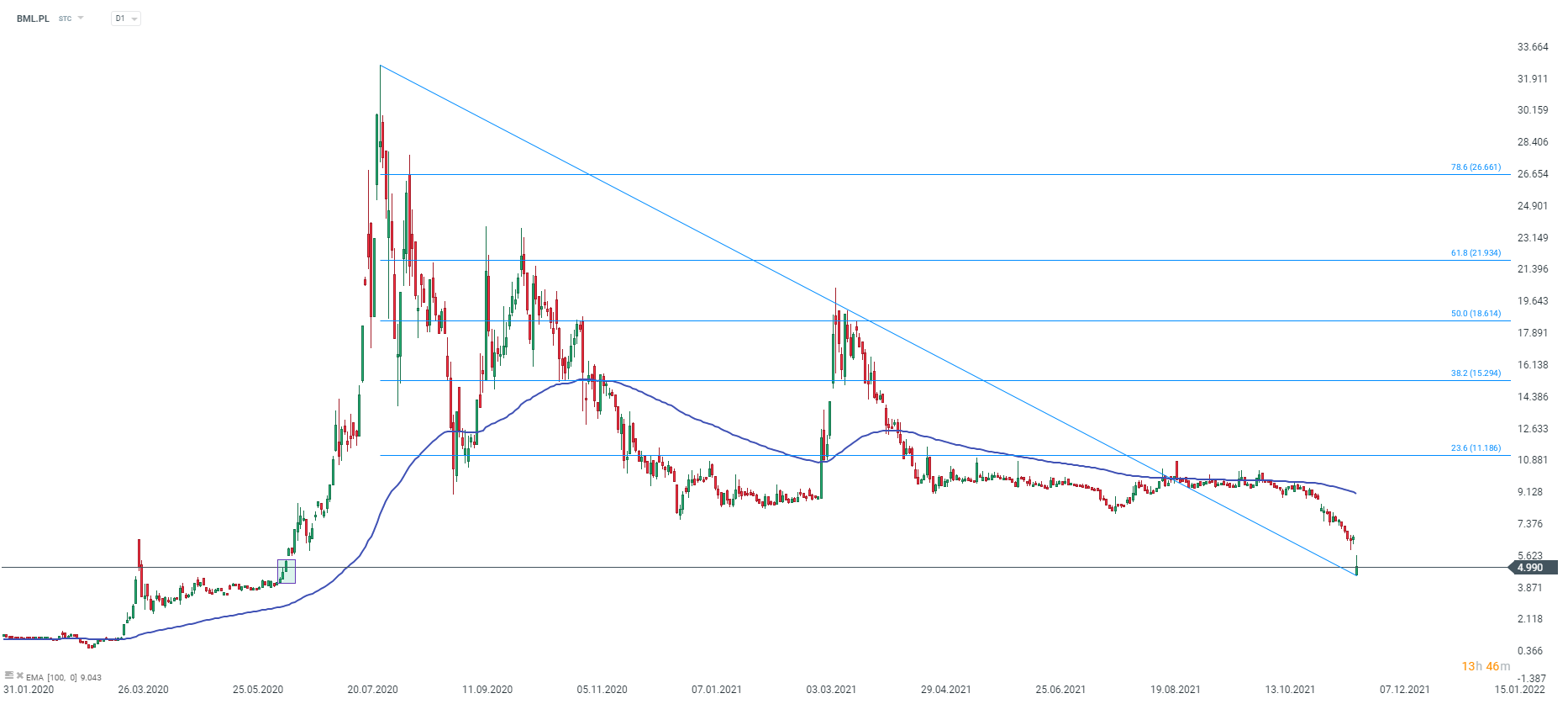 Wykres walorów spółki Biomed (BML.PL), interwał D1. Spółka od początku boom’u covidowego notowana jest w trendzie spadkowym i obecnie schodzi do najniższych poziomów od czerwca 2020 roku. Warto pamiętać, że spółka jako iż działa w branży medycznej, jest podatna na silne ruchy spekulacyjne w związku z kolejnymi wiadomościami dotyczącymi zagrożenia epidemią Covid. Najbliższymi oporami dla akcji są obecnie poziomy wyznaczone przez 100 okresową średnią kroczącą (niebieska linia) oraz zniesienie 23,6% Fibo (11,20zł za akcję). Kolejnym kluczowym wsparciem jest psychologiczna bariera 4 zł za akcję. Źródło: xStation 5