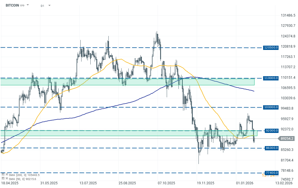 Bitcoin w ostatnim czasie przechodzi trudny okres. Po poand 30% korekcie w czwartym kwartale 2025 roku notowania największej kryptowaluty pozostają w konsolidacji. W ostatnich tygodniach Bitcoin próbował nawet wybić sie górą z konsolidacji, jednak wzrost napięć na arenie miedzynarodowej doprowadził do redukcji apetytu na ryzyko inwestorów, a wraz z nim na cofnięcie notowań Bitcoina ponizej 90000 USD.