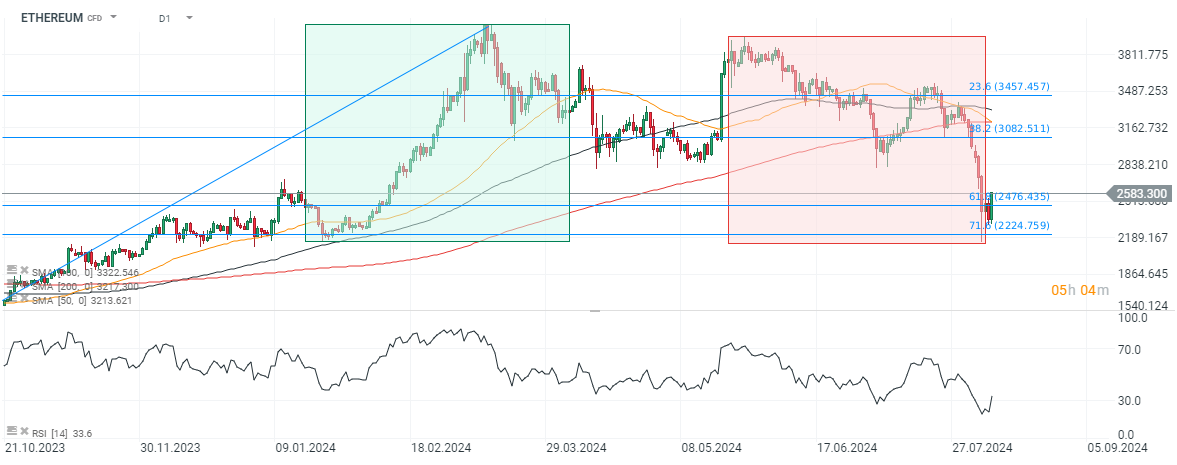 Ethereum zatrzymało "krach" z 3800 USD do 2200 USD również w pobliżu 71,6 zniesienia fali wzrostowej trwającej od września 2023 r., przy skali korekty niemal 1:1 zbliżonej do skali rajdu styczeń-marzec 2024 r. Główna strefa oporu znajduje się obecnie na 38,2 Fibo w pobliżu 3100 USD.