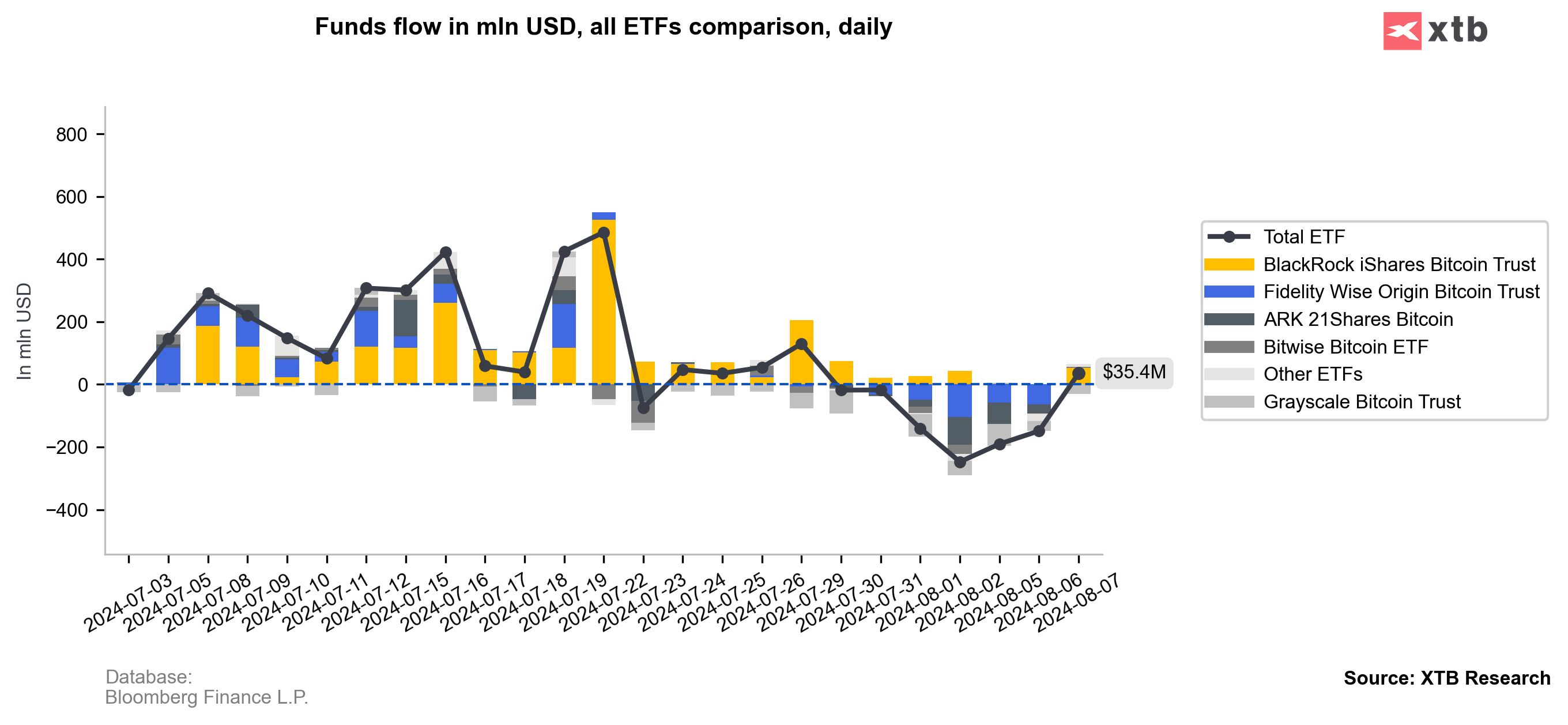Amerykańskie fundusze ETF na Bitcoina wykazały odpływy netto podczas ostatnich sesji, jednak skala tych odpływów nie była tak ogromna, z prawie zerowym odpływem netto z IBIT ETF BlackRock - pomimo "krachu" na wielu aktywach i rynkach finansowych. Źródło: XTB Research, Bloomberg Finance L.P.