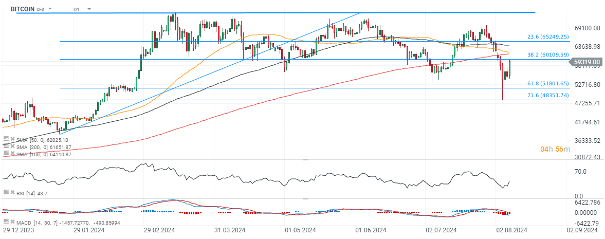 Bitcoin zatrzymał spadki dokładnie na poziomie 71,6 zniesienia Fibonacciego fali wzrostowej ze stycznia 2024 roku. Jak na razie BTC jest nadal notowany poniżej kluczowej strefy oporu na poziomie 61 500 USD i 38,2 zniesienia Fibonacciego na poziomie 60 000 USD.