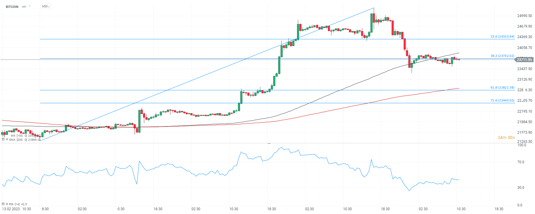 Bitcoin, interwał M30. Bitcoin próbuje walczyć o wejście powyżej 38,2 zniesienia Fibonacciego fali wzrostowej rozpoczętej 13 lutego, jednak byki mają wyraźny problem z jej pokonaniem a formacja lokalnego podwójnego szczytu w okolicach 24 000 USD może wskazywać na wyczerpanie popytu i dalsze spadki jeśli sentyment na Wall Street, z którym korelują kryptowaluty okaże się dziś tak samo negatywny. Główna kryptowaluta nie zdołała odbić powyżej SMA100 (czarna linia). Źródło: xStation5