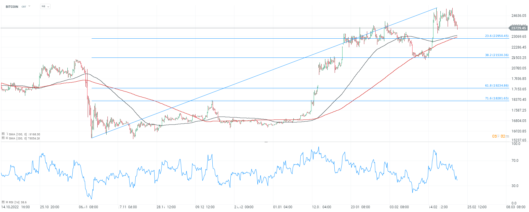 Bitcoin, interwał H4. Ostatnie dni pokazały, że w okolicach 25,000 USD uruchomiła się bardzo silna podaż, z którą byki mogą mieć problem - kilkukrotnie nie udało sie już wznieść powyżej tego oporu i jeśli ogólny sentyment wokół ryzykownych aktywów znacząco się nie poprawi - Bitcoin może powoli zmierzać w kierunku retestu 20,000 USD. Krótkoterminowo jednak kluczowym poziomem może okazać się 23,000 USD gdzie przebiega SMA200 i SMA100 (czerwona i czarna linia) oraz 23,6 zniesienie Fibonacciego, fali wzrostowej zapoczątkowanej w listopadzie 2022 roku. Źródło: xStation5