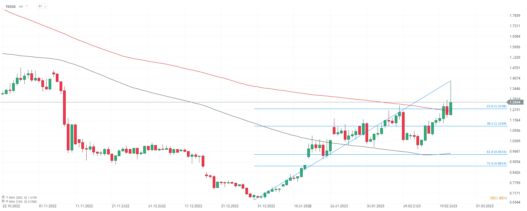 Tezos, interwał D1. Cena wzbiła się powyżej SMA200 (czerwona linia) oraz 23,6 zniesienia Fibonacciego fali wzrostowej zapoczątkowanej jesienią 2022 roku i dopóki cena znajduje sie powyżej 1,22 USD trend wzrostowy może być kontynuowany. Źródło: xStation5
