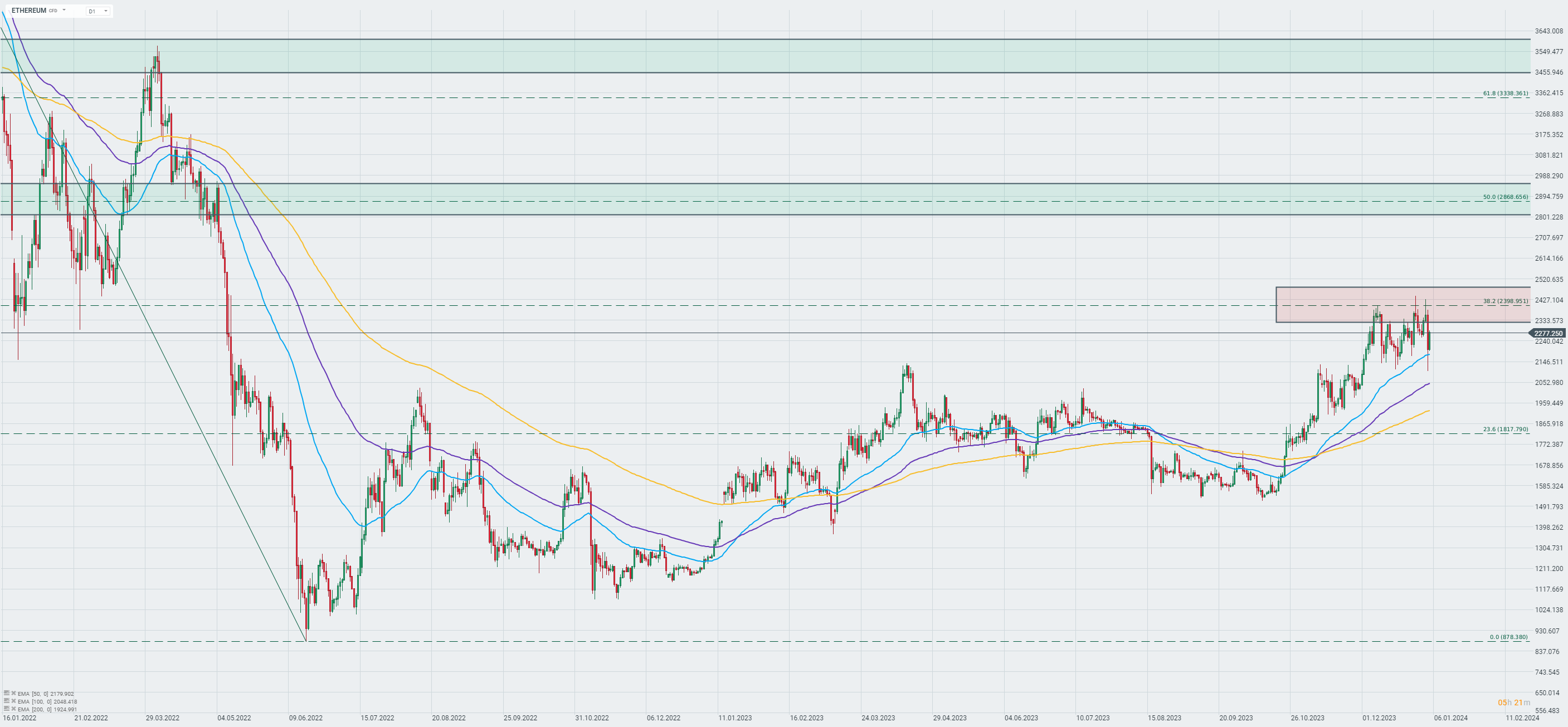 Ethereum również odzyskuje nieco gruntu po wczorajszej dynamicznej wyprzedaży. W ujęciu lokalnej geometrii rynku ważne poziomy kontrolne mogą teraz stanowić 50- dniowa EMA (niebieska krzywa) oraz strefa 2400 dolarów, gdzie przebiega zniesienie 38,2% Fibo fali spadkowej zapoczątkowanej w listopadzie 2021 roku. Źródło: xStation