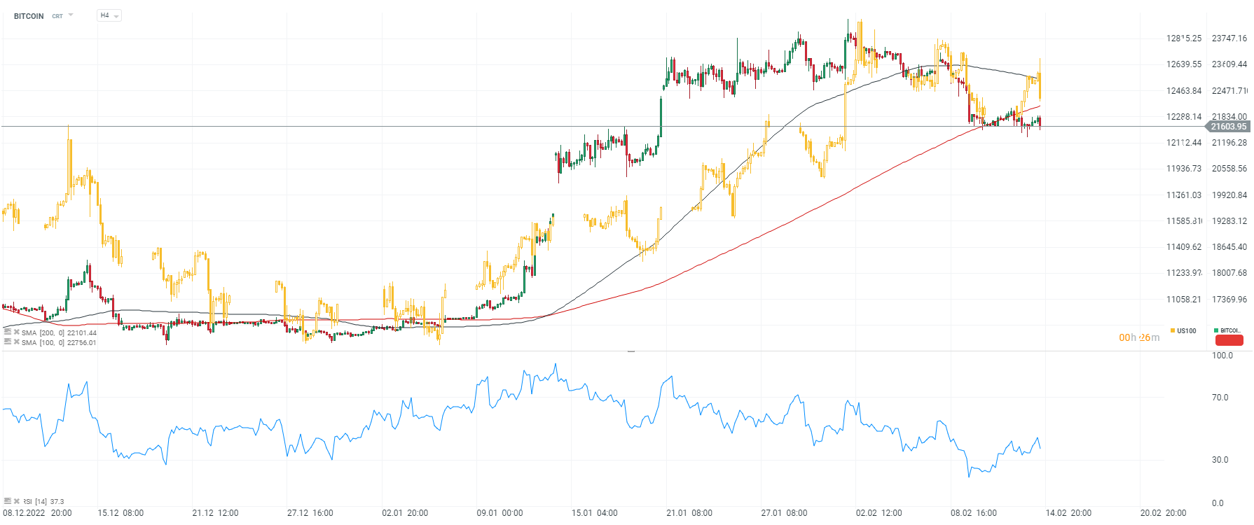 Wykres Bitcoina, interwał M30 w zestawieniu z kontraktami na Nasdaq100 (US100, złoty wykres). W ostatnim czasie cena po raz pierwszy od początku stycznia zanurkowała poniżej 200 sesyjnej średniej (czerwona linia) sygnalizując osłabienie. Potencjalną strefą do przetestowania w średnim terminie może okazać się 20 000 USD, jeśli niedźwiedzie zdominują indeksy z którymi koreluje Bitcoin. Źródło: xStation5