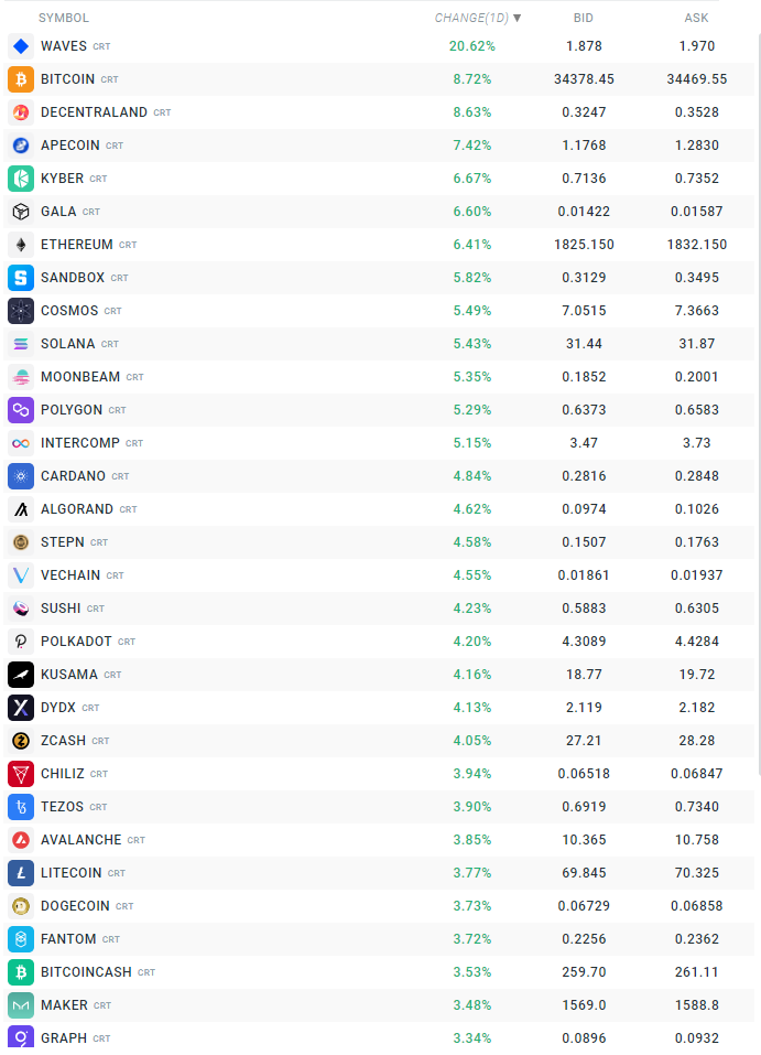 Bitcoin chwilowo przekroczył barierę 35 000 USD i w chwili obecnej notowany jest w strefie 34 500 USD. Co warto wspomnieć, poziomy te były nie były notowane od maja 2022 roku. Źródło: xStation 5