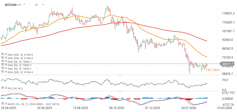 Cena BTC znajduje się dziś w górnym zakresie kanału konsolidacji po ostatnich spadkach i wydaje sie, że główny test siły mógłby nadejsć w scenariuszu wzrostu do ok. 76 tys. USD gdzie przebiega średnia EMA50 - która kilkukrotnie już pełniła funkcje istotnego poziomu oporu od jesieni tego roku (m.in. w pierwszej połowie października 2025 i w połowie stycznia 2026). Wybicie powyżej mogłoby zwiastować presję na powrót do 90 tys. USD. Z drugiej strony spadkowa reakcja w przedziale 70 - 76 tys. USD mogłaby uruchomić kolejny impuls spadkowy z potencjalnym tąpnięciem poniżej 60 tys. USD.