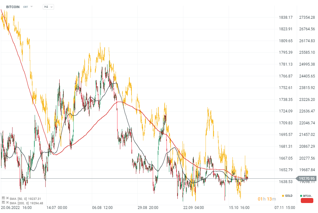 Bitcoin, interwał H4. Bitcoin pokazuje w ostatnim czasie silną korelację z cenami złota, zmienność kryptowaluty pozostaje ograniczona. Średnie SMA50 (czarny) i SMA200 (czerwony) poruszają sie w ruchu bocznym, zachowując między sobą dystans, który dzieli Bitcoina zarówno od 'złotego krzyża' jak i 'krzyża śmierci'. Wydaje się, że przecięcie obu średnich będzie zapowiedzią gwałtownego ruchu w którąś ze stron. Jeśli SMA50 przetnie od dołu SMA200, możemy oczekiwać wzrostów - taką sytuację obserwowaliśmy w drugiej części lipca. Jeśli odwrotnie - ruch spadkowy może przyspieszyć w kierunku 13 000 USD. Źródło: xStation5