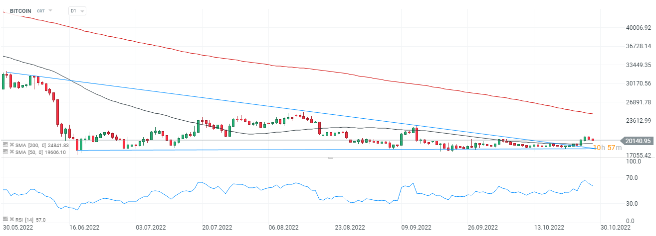 Wykres Bitcoina, interwał D1. Cena największej kryptowaluty poruszała się w formacji zniżkującego trójkąta, co rodziło obawy o wybicie z bocznego trendu 'na południe'. Bitcoin zaskoczył niedźwiedzi wzrostową reakcję jednak wciąż jest zbyt wcześnie by odtrąbić zmianę trendu. Średnia SMA50 (czarny) nieznacznie wzrosła, lecz do przecięcia z SMA200 (czerwony) wciąż jest daleko. Jeśli średnie utrzymają aktualne momentum przecięcie mogłoby mieć miejsce w okolicach 22 500 USD sygnalizując prawdopodobną zmianę trendu na wzrostowy przez tzw. 'złoty krzyż'. Historycznie wyjściu Bitcoina z bessy zawsze towarzyszyło przecięcie obu tych średnich. Główne wsparcie stanowią okolice 20 000 USD oraz poziomy przy 19 600 USD, gdzie przebiega SMA50. Spadek poniżej nich mógłby zwiastować gwałtowną presję podażową i 'zdemaskować' ewentualne fałszywe wybicie. Źródło: xStation5
