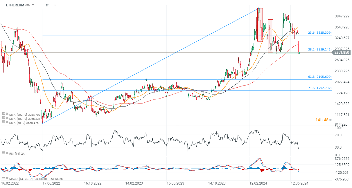 Informacja na temat spotowych funduszy ETF, wydana w czerwcu nie zdołała trwale wesprzeć momentum cenowego Ethereum; kryptowaluta notowana jest najniżej od maja; na poziomie tym znajdują się także istotne reakcje cenowe z kwietnia i w okolicach 2800 USD kupujący mogą szukać pierwszej szansy odreagowania dynamicznego spadku.